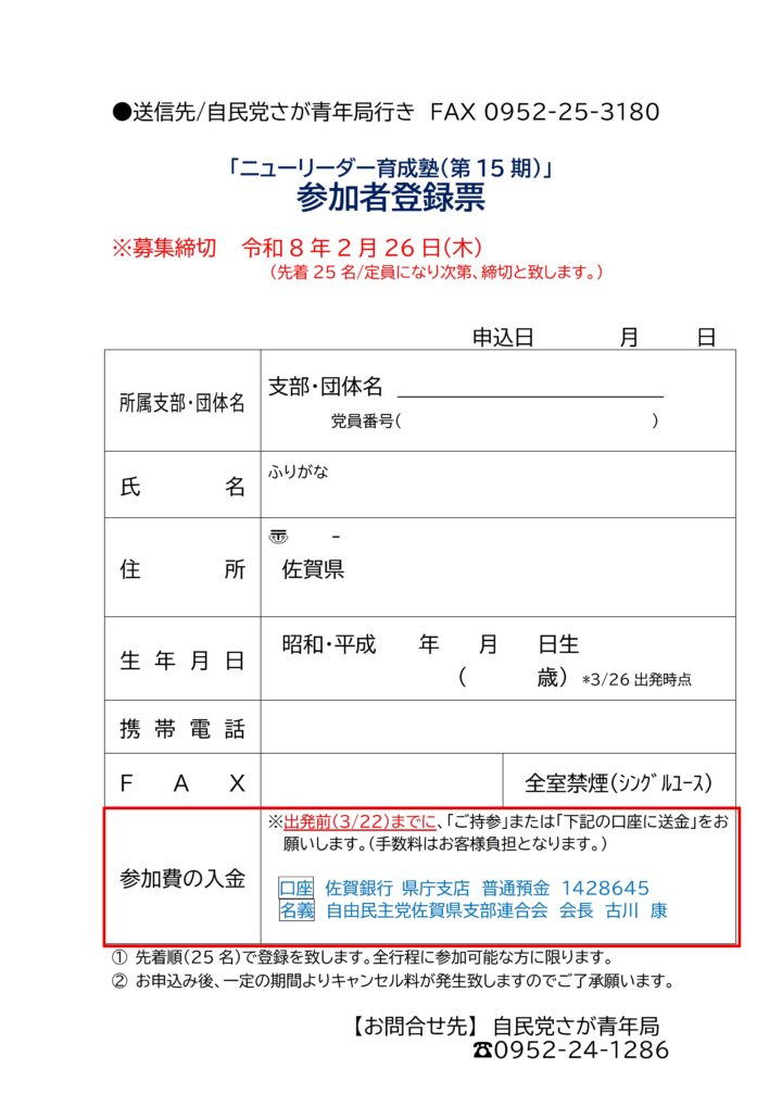 お知らせ 自由民主党 > お知らせ > 青年局 > ニューリーダー育成塾(第15期)塾生募集を開始します お知らせ 更新日:2026年01月07日 ニューリーダー育成塾(第15期)塾生募集を開始します Facebookでシェア Xでツイート PageTop